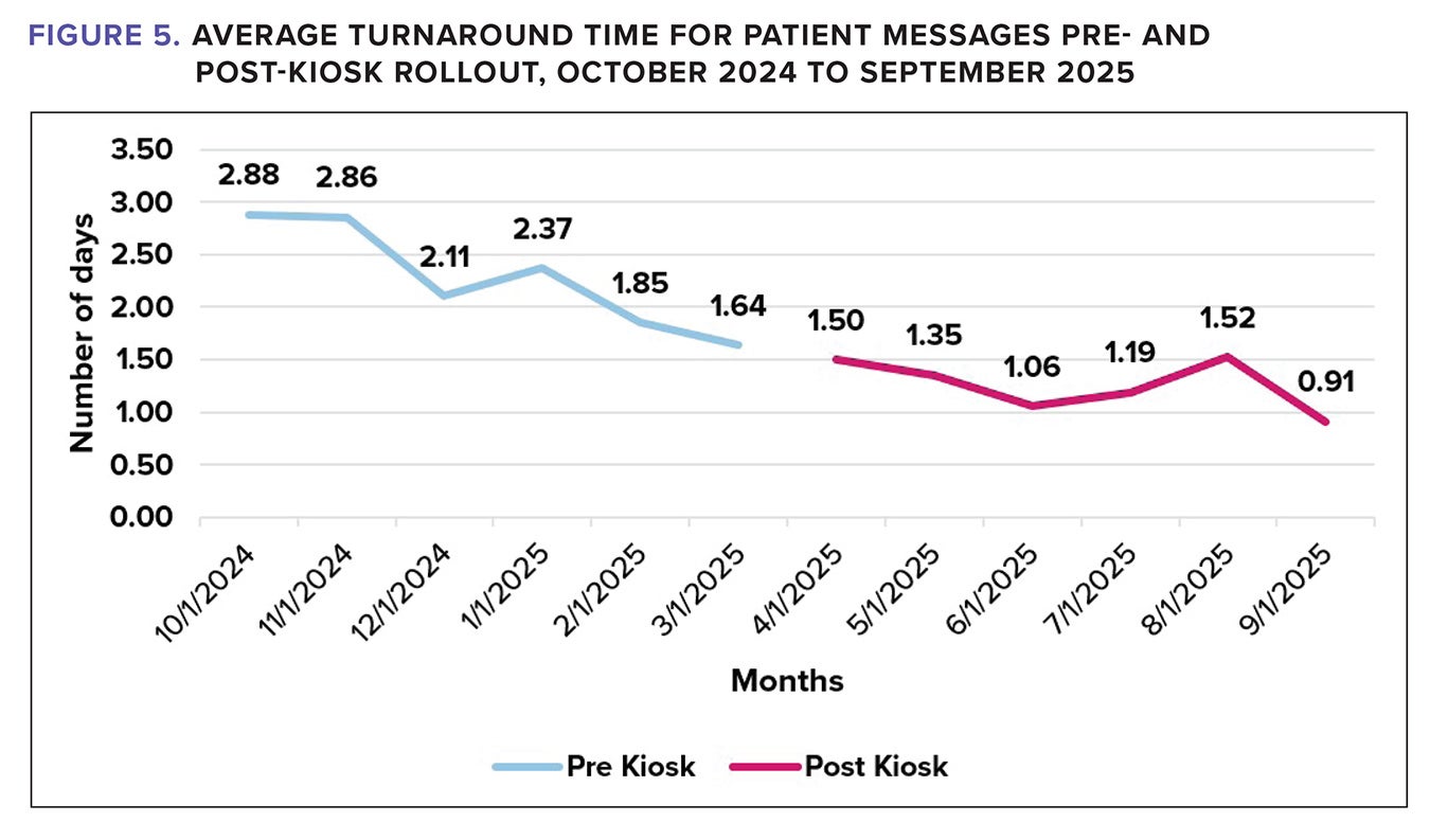 With fewer patients presenting to the front desk for check-in, additional capacity is created. Preliminary data suggests about 30%-time savings for front desk staff to redirect attention on other tasks. One such task is addressing patient messages. Patient messages are expected to be resolved within two business days. Practice locations integrated with self-service kiosks demonstrate a 30% reduction in turnaround time over a 6-month period. This performance has a positive impact on patient experience and health outcomes. (See Figure 5.)