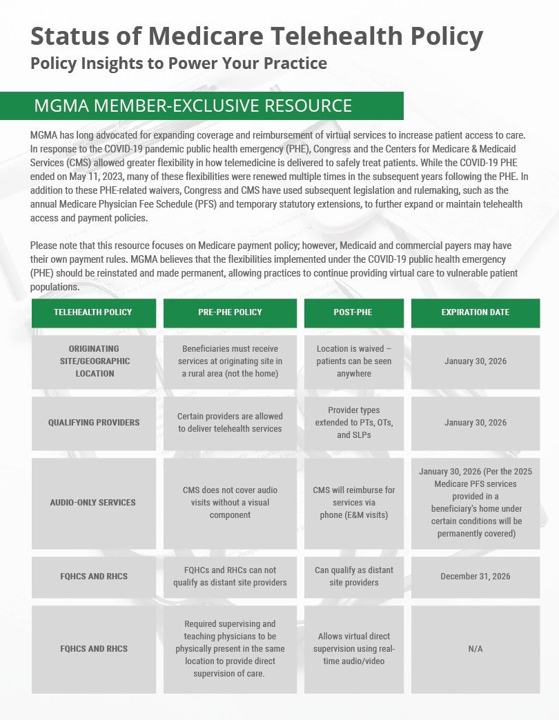 MGMA has long advocated for expanding coverage and reimbursement of virtual services to increase patient access to care. In response to the COVID-19 pandemic public health emergency (PHE), Congress and the Centers for Medicare & Medicaid Services (CMS) allowed greater flexibility in how telemedicine is delivered to safely treat patients. While the COVID-19 PHE ended on May 11, 2023, many of these flexibilities were renewed multiple times in the subsequent years following the PHE. In addition to these PHE-related waivers, Congress and CMS have used subsequent legislation and rulemaking, such as the annual Medicare Physician Fee Schedule (PFS) and temporary statutory extensions, to further expand or maintain telehealth